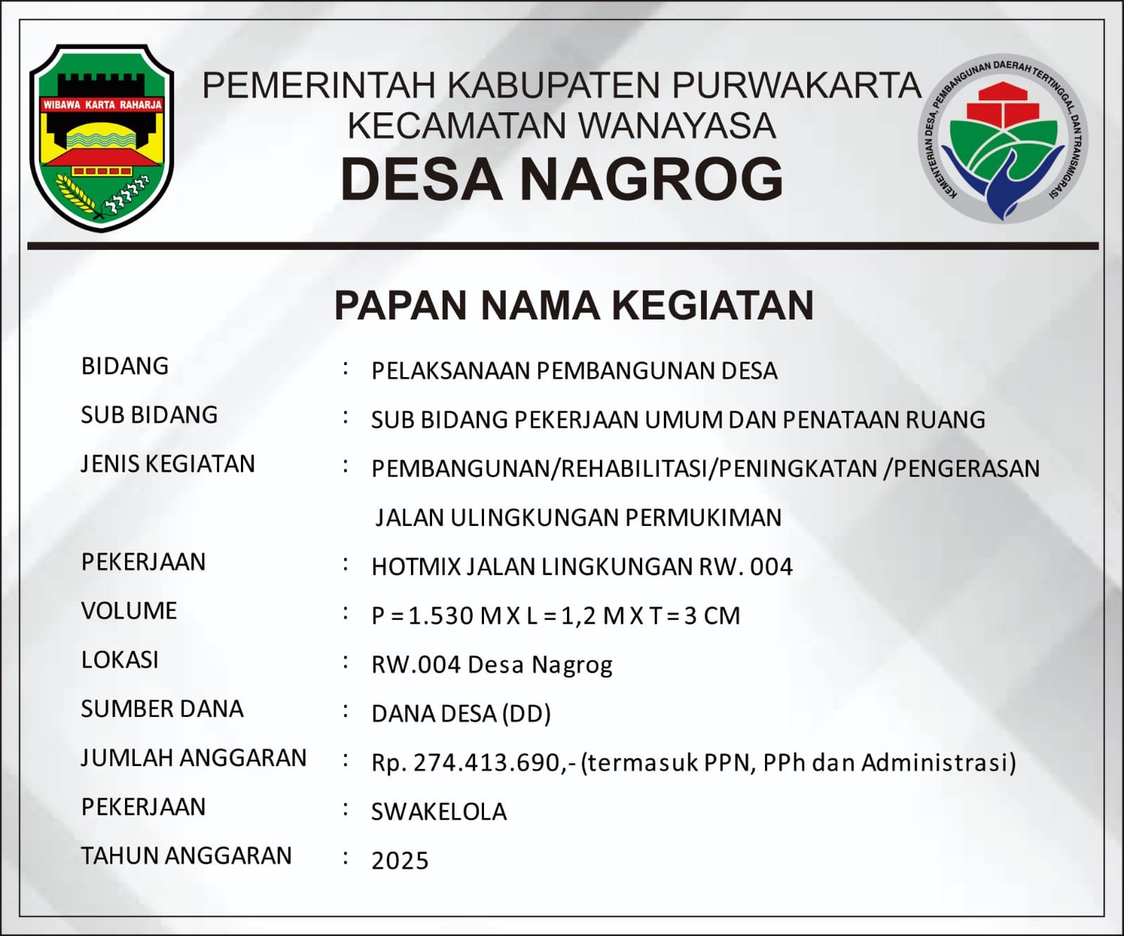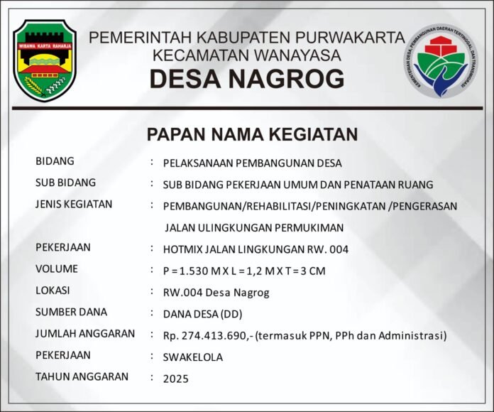 Kepala Desa Nagrog menjelaskan bahwa pembangunan tersebut menggunakan Dana Desa tahap II dengan total anggaran sebesar Rp 274.413.690. Proyek infrastruktur ini juga melibatkan LPM serta swadaya masyarakat setempat. Spesifikasi jalan yang dibangun memiliki panjang 1.530 meter, lebar 1,2 meter, dan ketebalan 3 cm.