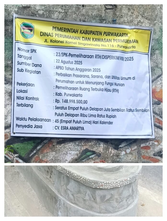 Purwakarta | Actualnews.id – Proyek pemeliharaan taman ruang terbuka hijau (RTH) sekaligus perbaikan sarana dan prasarana ruang umum penunjang hunian di Jalan Raya Rawa Roko, samping rel kereta api, Kelurahan Tegalmunjul, Kabupaten Purwakarta, kini tengah dikerjakan. Perbaikan dilakukan karena kondisi taman sebelumnya sudah mulai mengalami kerusakan.Selasa.(09/25)