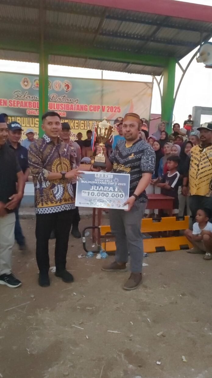 Penyerahan trofi juara Mini Soccer V Cup Bulusibatang dan hadiah berupa uang tunai sebesar Rp 10.000.000 diberikan kepada Tim Ilalang FC, yang diwakili oleh pelatih sekaligus pemilik tim, Abdul Aris Dg Lalang, dari Desa Jombe, Kecamatan Turatea, Kabupaten Jeneponto.ACN/Asriel/RED