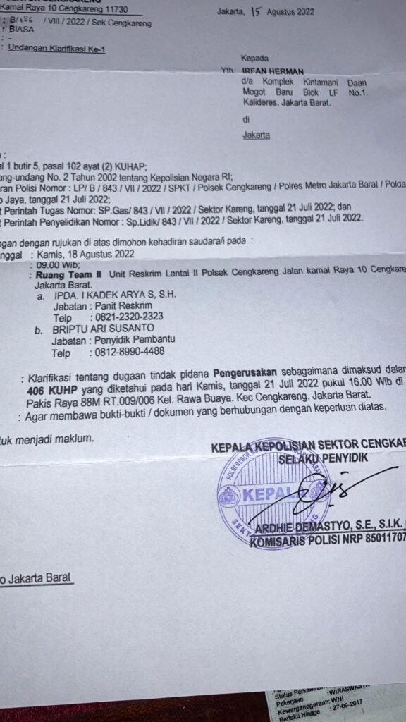 ACTUALNEWS.ID, Jakarta – Setelah merasa dirugikan dan di laporkan kepihak Polsek Cengkareng oleh PT. Protelindo atas dugaan tindak pidana pengrusakan sesuai pasal 406 KUHP, akhirnya dengan niat baik Irfan Herman pemilik ruko yang terletak dijalan Pakis Raya 88M, Rt 009, Rw 006, Kelurahan Rawa Buaya, Kec Cengkareng, Jakarta Barat memenuhi panggilan ke polsek cengkareng, Kamis, 18/8/2022.