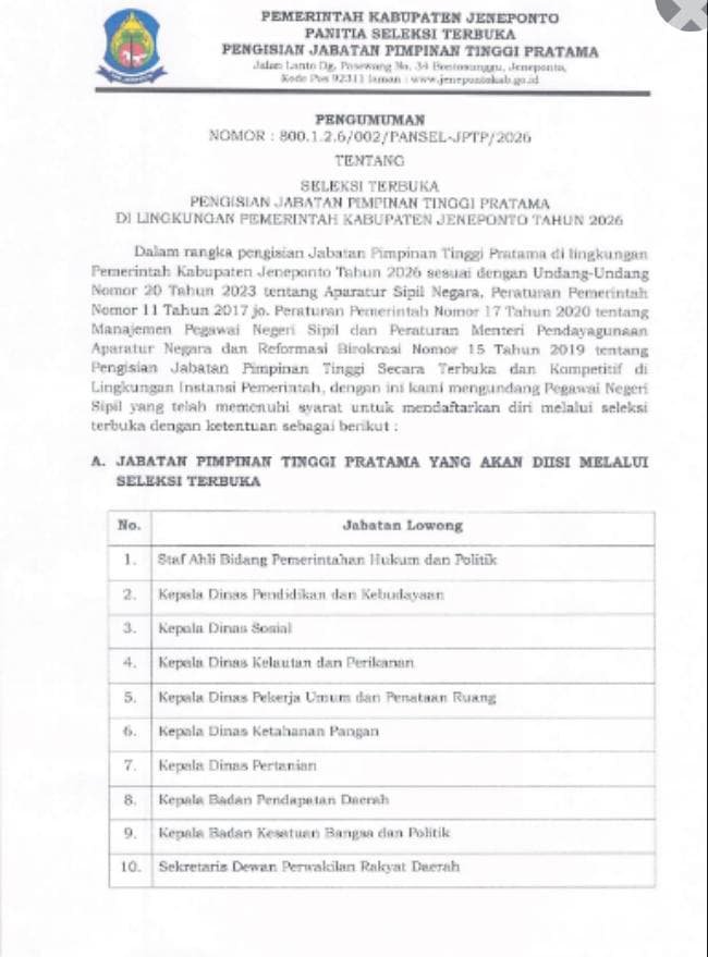ACTUALNEWS.ID Jeneponto — Pemerintah Kabupaten Jeneponto resmi membuka Seleksi Terbuka Jabatan Pimpinan Tinggi (JPT) Pratama Tahun 2026 untuk mengisi sejumlah jabatan strategis di lingkungan Pemerintah Kabupaten Jeneponto.