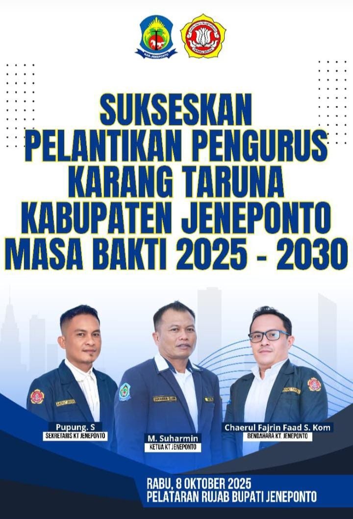 ACTUALNEWS.ID, Jeneponto, 7 Oktober 2025 — Pemerintah Kabupaten Jeneponto bersama seluruh elemen masyarakat dan organisasi kepemudaan siap menyukseskan kegiatan Pelantikan Pengurus Karang Taruna Kabupaten Jeneponto masa bakti 2025–2030, yang akan digelar pada Rabu, 8 Oktober 2025, di pelataran Rumah Jabatan (Rujab) Bupati Jeneponto.