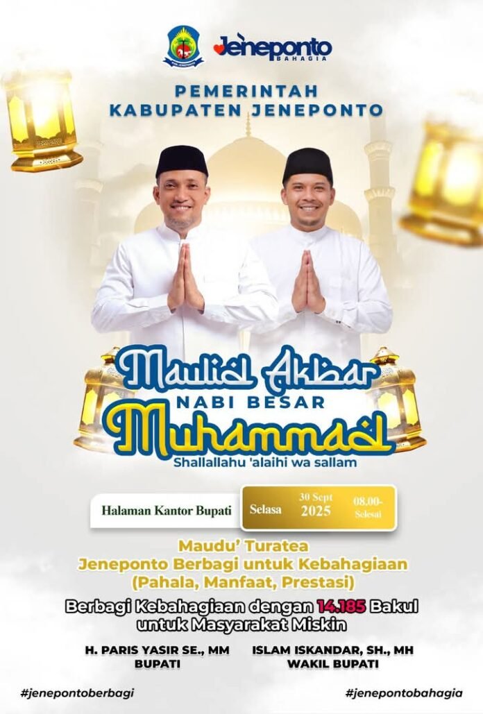 ACTUALNEWS.ID Jeneponto Jumat 26/9/2025 – Pemerintah Kabupaten Jeneponto kembali menunjukkan komitmennya dalam menghadirkan kebahagiaan untuk masyarakat melalui kegiatan keagamaan yang penuh makna. Pada Selasa, 30 September 2025, Pemkab Jeneponto akan menggelar Maulid Akbar Nabi Besar Muhammad Shallallahu ‘alaihi wa sallam di Halaman Kantor Bupati Jeneponto.