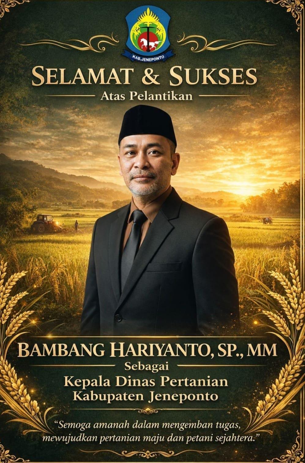 Doa dan ucapan selamat kepada Bambang Hariyanto, S.P., M.M., datang dari seluruh kalangan pegawai/ASN Pemerintah Kabupaten Jeneponto atas pelantikannya sebagai salah satu Kepala OPD, Dinas Pertanian.