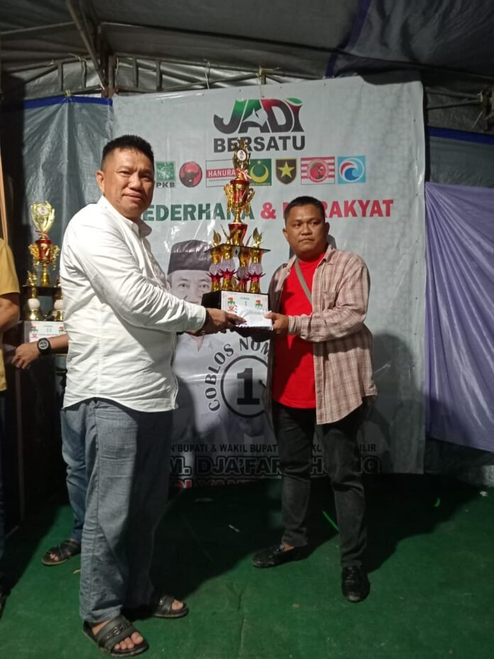 Calon Wakil Bupati OKI nomor urut 1, Abdiyanto Fikri, turut hadir menyerahkan piala dan uang pembinaan kepada para pemenang. Ia mengapresiasi inisiatif pemuda Kebon Cabe dan berjanji akan mendukung penuh pengembangan bakat anak muda jika terpilih.
