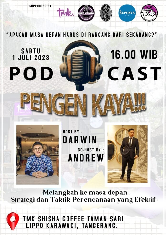 Saya Darwin & Andrew akan membawakan Acara Pod Cast Seru “PENGEN KAYA di TMK Shisha Coffee pada hari Sabtu besok, 1 Juli 2023 Jam 16:00 – Selesai hanya ada di TMK SHISHA COFFEE – Taman Sari Lippo Karawaci, ujar Darwin saat dihubungi awak media via whatsapp.