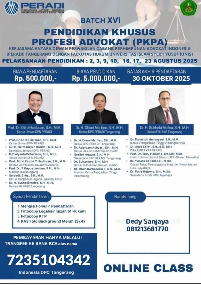 Dewan Pimpinan Nasional Perhimpunan Advokat Indonesia (DPN PERADI) bekerja sama dengan DPC PERADI Tangerang dan Dragon Law Firm dan Fakultas Hukum Universitas Islam Syekh Yusuf Tangerang (FH UNIS) membuka Pendidikan Khusus Profesi Advokat (PKPA) dengan metode hybrid (daring dan luring).