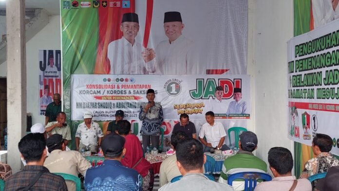 ACTUALNEWS.ID, OKI , –Sebagai langkah untuk memperkuat dukungan jelang Pilkada Kabupaten Ogan Komering Ilir (OKI) tahun 2024, Tim Pemenangan Kecamatan Mesuji menggelar acara konsolidasi di Desa Suryadi pada Selasa, 12 November 2024. Acara ini dihadiri langsung oleh Calon Bupati OKI nomor urut 1, Dja’far Shodiq, didampingi oleh Ketua Tim Pemenangan Kabupaten Juni Alpansuri.