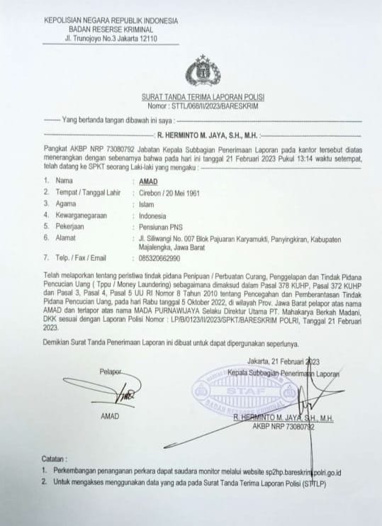 UU RI Nomor 8 Tahun 2010 tentang pencegahan dan pemberantasan tindak pidana pencucian uang pada hari Rabu 5 Oktober 2022 diwilayah provinsi Jawa barat pelapor atas nama Amad dan terlapor atas nama Mada Purnawijaya, SE.selaku direktur utama PT.Mahakarya Berkah Madani.