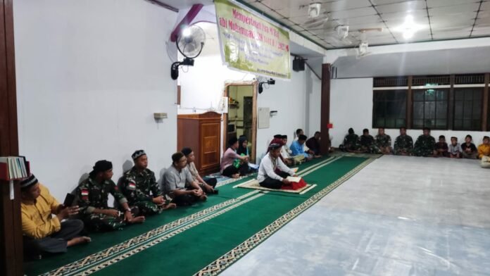 ACTUALNEWS.ID SINTANG – Personel Satgas Pamtas RI-Malaysia Yonarmed 19/105 Trk Bogani Pos Kout di pimpin langsung oleh Wadansatgas Kapten Arm Rico Sanjoko beserta 10 orang anggota mengikuti Peringatan Isra Miraj Nabi Muhammad SAW 1444 H/2023 M di Masjid Al Ikhlas, Desa Senaning, Kecamatan Ketungau Hulu, Kabupaten Sintang, Kalimantan Barat.