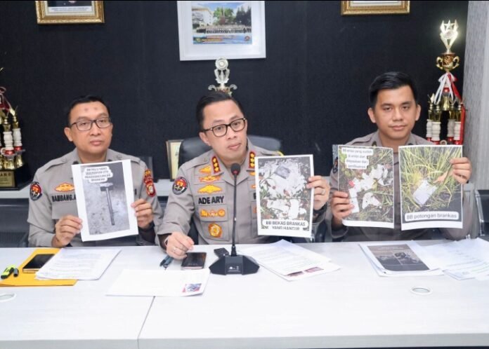 “Ini berkas brankas yang hancur, ini ditemukan tidak di TKP lagi. Nah ini alatnya yang digunakan (palu). Jadi brankasnya diangkat (keluar TKP),” kata Ade Ary.
