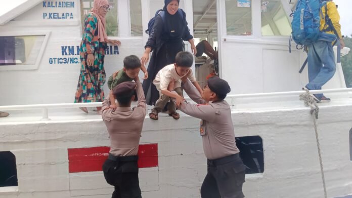 Polisi Baik! Aiptu Syaihul Azhar Bantu Penumpang Turun dari Kapal dalam Pengamanan Dermaga Pulau Kelapa