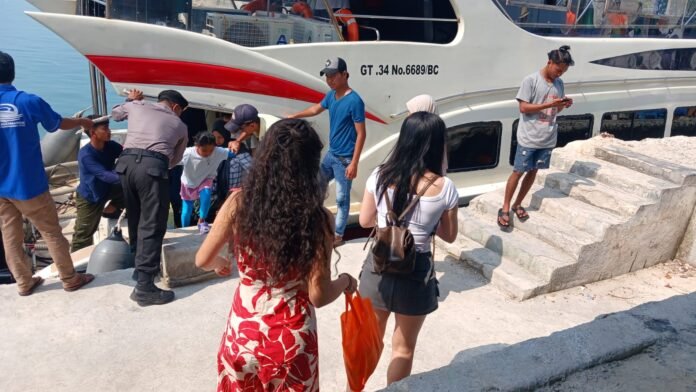 “Kami tidak hanya membantu warga dan wisatawan saat turun dari kapal, tapi juga melakukan pemeriksaan barang bawaan untuk memastikan tidak ada barang terlarang seperti narkoba dan minuman keras yang masuk ke wilayah kami,” jelas AKP Sanyata Harsono.