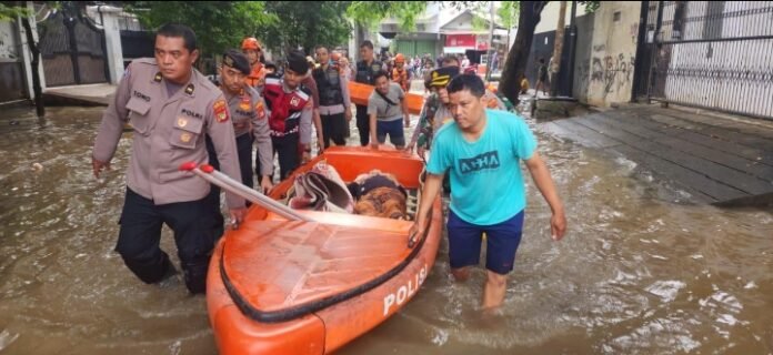 Kapolsek Cengkareng, Kompol Abdul Jana, turut hadir di lokasi untuk memastikan evakuasi berjalan lancar. Anggota kepolisian membopong dan menggendong warga lansia yang sakit stroke, melewati genangan air menuju perahu evakuasi.