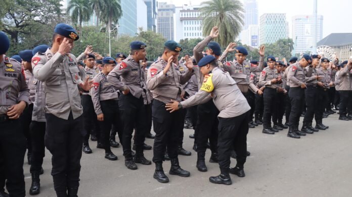 ACTUALNEWS.ID, Jakarta Pusat – Jajaran Kepolisian dari Polda Metro Jaya bersama Polres Metro Jakarta Pusat dan Polsek jajaran menggelar apel pengamanan aksi unjuk rasa yang digelar Badan Eksekutif Mahasiswa Seluruh Indonesia (BEM SI) serta sejumlah elemen massa di Silang Selatan Monas Gambir, Jakarta Pusat, Senin (28/7/2025).