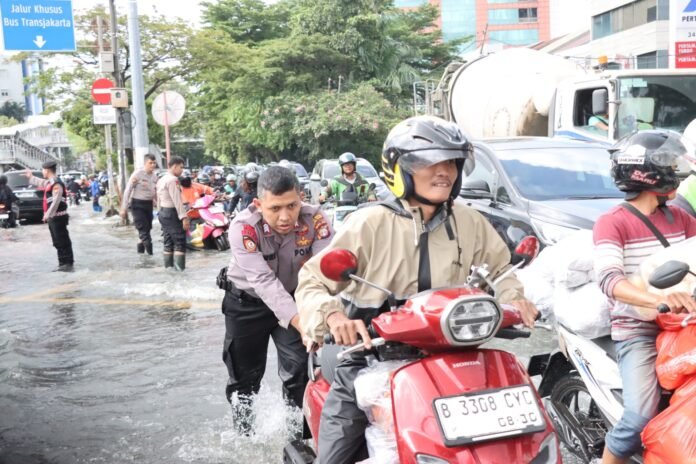 Ia menjelaskan bahwa personel diterjunkan untuk memastikan arus lalu lintas tetap berjalan serta membantu masyarakat yang mengalami kesulitan akibat genangan air.