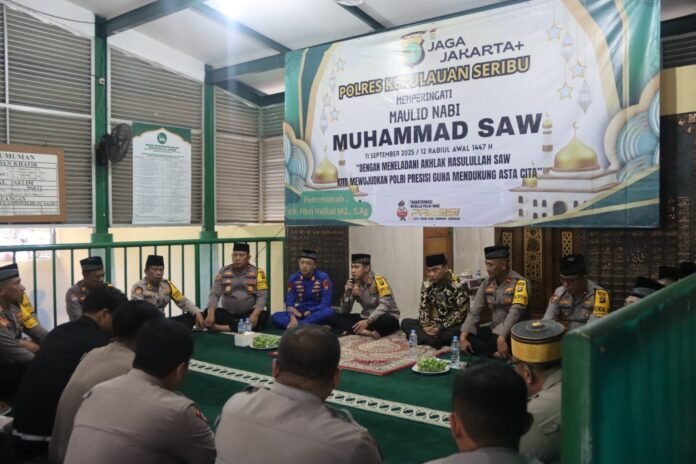 ACTUALNEWS.ID, Polres Kepulauan Seribu menggelar kegiatan Do’a Bersama dan Peringatan Maulid Nabi Besar Muhammad SAW Tahun 1447 H / 2025 M, Kamis (11/09/2025). Acara ini berlangsung khidmat di Masjid Baitul Jannah Polres Kepulauan Seribu, Marina Ancol, Jakarta Utara, dengan dihadiri Kapolres, pejabat utama, anggota, pengurus Bhayangkari, serta jamaah masyarakat sekitar.