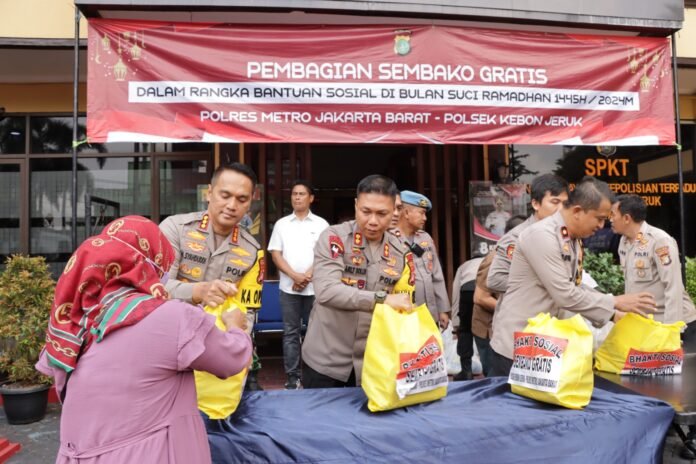 ACTUALNEWS.ID Jakarta Barat, – Dalam semangat kebersamaan dan empati di Bulan Suci Ramadhan 1445 H, Polres Metro Jakarta Barat bersama dengan Polsek Kebon Jeruk menggelar kegiatan bantuan sosial (Baksos) berupa pembagian paket sembako gratis.