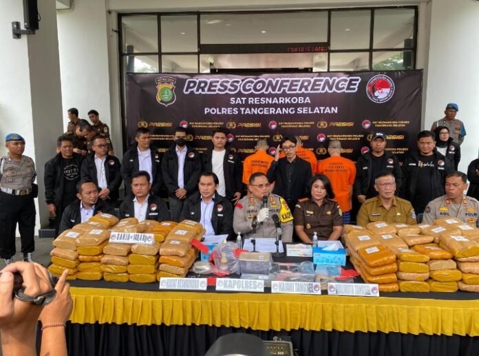 “Hari ini Polres Tangsel melaksanakan Konferensi Pers pengungkapan narkotika jenis ganja seberat 140,4 Kg, dimana kejadian pada Jumat tanggal 09 Agustus 2024 dengan TKP di Jl. Raya Serang-Bitung, Kel. Kadu Jaya, Kec. Curug, Kabupaten Tangerang” jelas AKBP Ibnu Bagus.