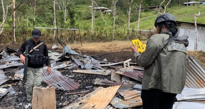 ACTUALNEWS.ID, Yahukimo — Personel Satgas Gakkum Operasi Damai Cartenz 2025 melakukan kegiatan evakuasi dan olah tempat kejadian perkara (TKP) atas insiden penyerangan terhadap guru honorer dan tenaga kesehatan serta pembakaran fasilitas publik di Distrik Anggruk, Kabupaten Yahukimo, Senin (24/3).