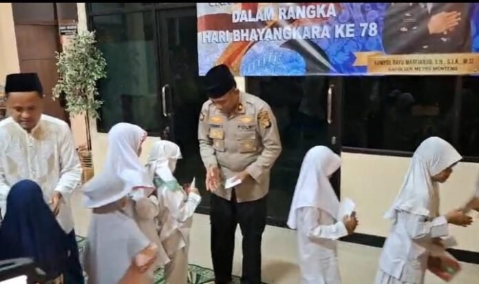 Meneruskan pesan Kapolres Metro Jakarta Pusat Kombes Pol Susatyo Purnomo Condro melalui Kapolsek Metro Menteng Kompol Bayu Marfiando kecintaan Polri berbagi kepada anak-anak yatim piatu wujud Polri Presisi.