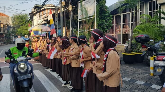 Usai kegiatan, personel Polsek bersama perwakilan guru dan siswa membagikan 100 pita dan bendera merah putih kepada pengguna jalan sebagai bagian dari perayaan HUT RI ke-80.