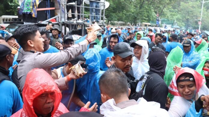 Di tengah hujan, Polwan bersama petugas kepolisian lainnya terlihat membagikan roti dan air mineral kepada para peserta unjuk rasa. Langkah tersebut menjadi wujud pelayanan humanis Polri kepada masyarakat yang tengah menyampaikan aspirasi secara terbuka.