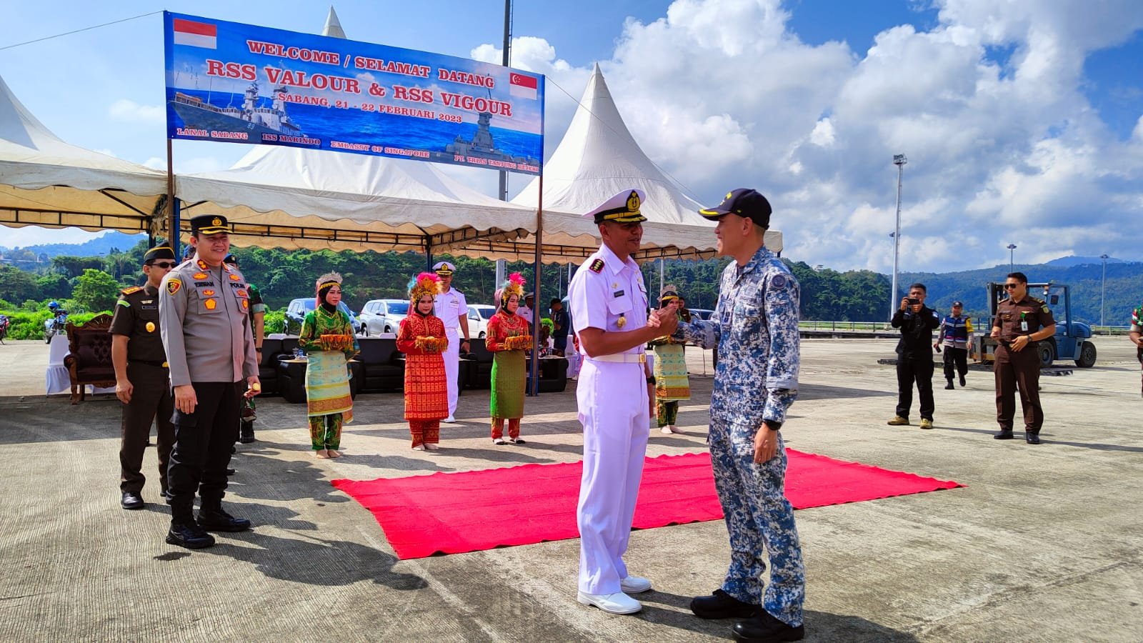 ACTUALNEWS.ID TNI AL, Sabang,- Komandan Lanal Sabang Kolonel Laut (P) Ali Setiandy, M.Tr (Han)., M.M., bersama FKPD Kota Sabang menyambut Kedatangan 2 (dua) Kapal Perang Singapura RSS Valour (89) dan RSS Vigour (92) di Sabang dalam rangka Port Call, bertempat di Pelabuhan CT-3 Sabang, Selasa (21/02/2023).