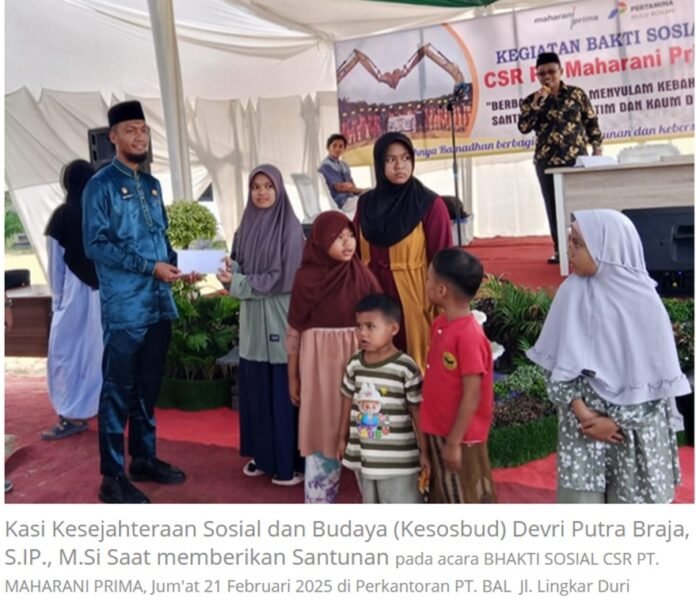 “Apresiasi kepada PT. Maharani Prima, sebuah perusahaan dimana masih pemain baru di project Pertamina Hulu Rokan (PHR), namun sudah berani memberikan Dana CSR nya kepada masyarakat tempatan dan anak Yatim Piatu 300 an lebih. Kami dari pemerintah Kecamatan Mandau Memberikan Apresiasi”. Jelas Braja dalam sambutannya.