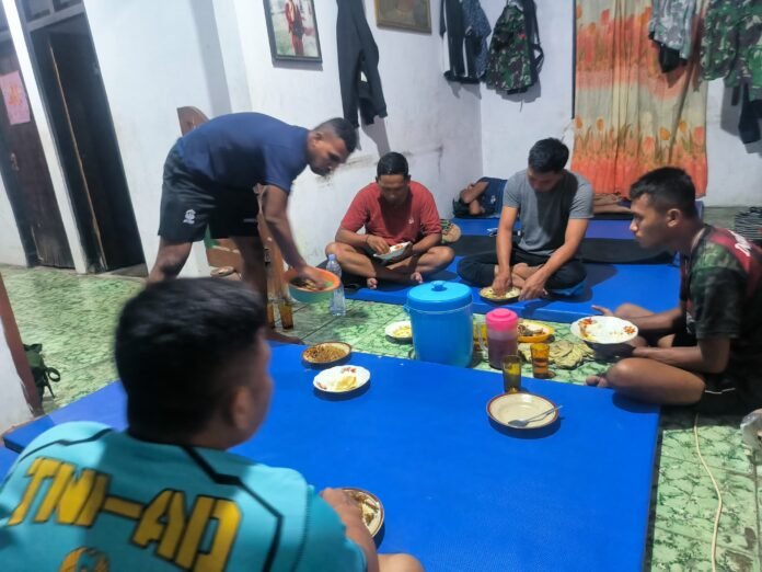 Pada pukul 03:00 WIB para anggota satgas TMMD sudah bangun pagi untuk melaksanakan makan sahur. Walaupun untuk ibadah makan sahur pertama dibulan Ramadhan tahun ini tidak bisa bersama anak dan istri bagi yang sudah berkeluarga, akan tetapi tidak mengurangi semangat dalam melaksanakan ibadah makan sahur. Para anggota satgas TMMD melaksanakan makan sahur seadanya dengan menu makan yang sudah dimasakan oleh induk semang”. Makan sahur termasuk dalam ibadah, jadi bukan dilihat dari menunya yang terpenting adalah niat melaksanakan ibadahnya”, ucap Prattu Mukhlis.