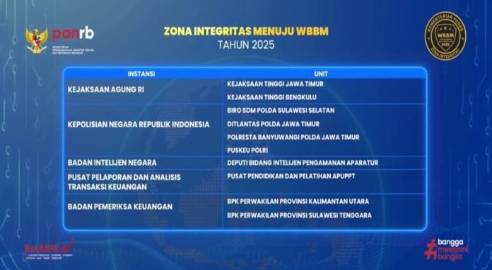 Berdasarkan hasil evaluasi nasional tahun 2025, nilai SAKIP Kementerian/Lembaga mencapai 73,61, pemerintah provinsi 69,05, dan pemerintah kabupaten/kota 64,89. Dari 297 instansi yang berpartisipasi dalam pembangunan Zona Integritas, sebanyak 133 di antaranya dinyatakan lolos predikat WBK dan/atau WBBM.