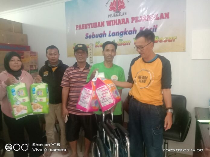 Ketua Paguyuban Wihara Pejagalan ( PWP ) Fredy Wey melalui ketua harian Hermawan berikan bantuan 1 unit kursi roda dan 160 pcs ( 4 pack ) pampers kepada warga pejagalan, yang datang ke kantor PWP di Jalan Masda, Teluk Gong Pejagalan, Kecamatan Penjaringan Jakarta-Utara. Kamis (7/9/2023).