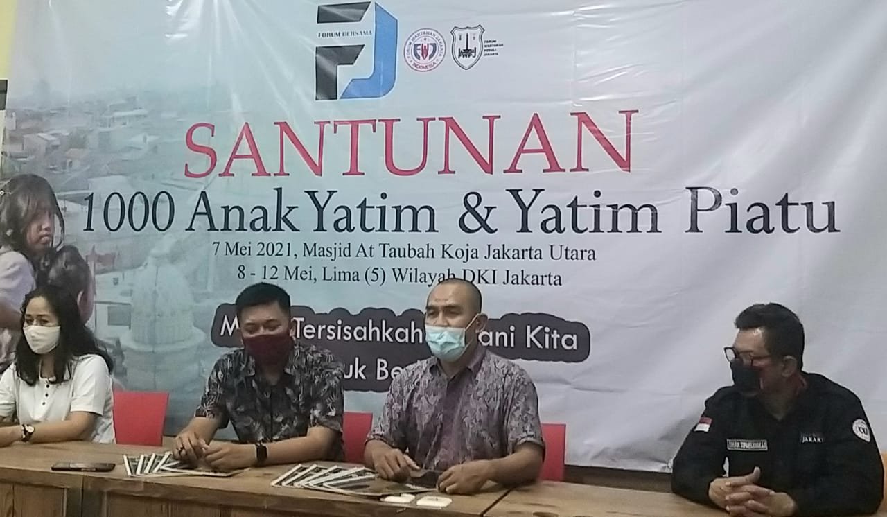 “Bismillahirrahmanirrahim. Insya Allah kami, dua forum wartawan yaitu Forum Wartawan Peduli Jakarta (FWPJ) dan Forum Wartawan Jakarta (FWJ) Indonesia bersinergi dalam sebuah Forum Bersama. Kami sepakat akan menggelar Santunan 1000 Anak Yatim dan Yatim Piatu di Masjid At-Taubah, Koja Utara, Jakut, pada Jumat siang sekitar pukul 14.00 WIB, 7 Mei 2021, “kata Agus di Kantor Sekretariat Forum Bersama, Jl. Dr. Saharjo, No. 238, Karet Kuningan, Setiabudi, Jakarta Selatan.