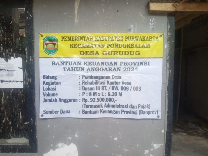 ACTUALNEWS.ID, Purwakarta | Pemerintah Desa Gurudug merealisasikan anggaran Bantuan Provinsi (Banprop) dengan memulai pembangunan kantor desa di Dusun III RT 09 RW 03. Pembangunan ini dilaksanakan dengan pagu anggaran sebesar Rp92.500.000 dan ukuran bangunan 8 meter panjang serta 8,20 meter lebar.Kamis,(03/24).
