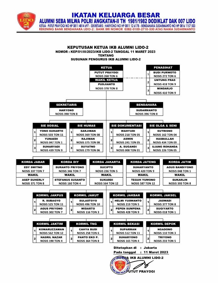 Organisasi ini dipimpin dengan dedikasi tinggi oleh Komisaris Besar Polisi (Purn.) Putut Prayogi dan mendapatkan bimbingan dari Penasihat Brigadir Jenderal Polisi (Purn.) Budi Purwoto.