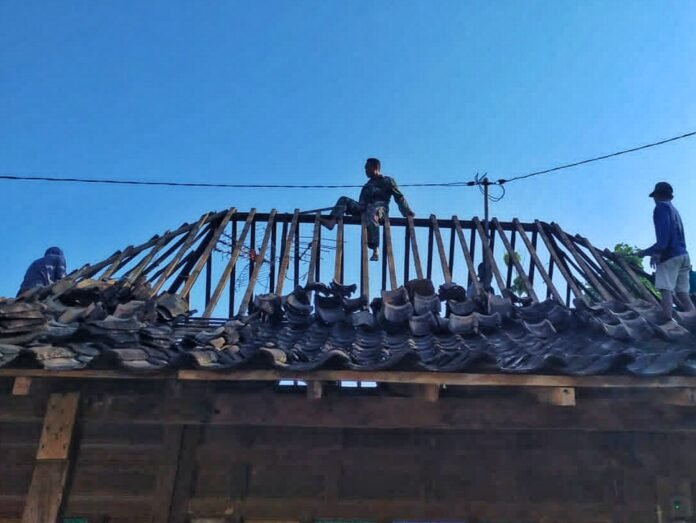 ACTUALNEWS.ID, Boyolali – Minggu yang cerah di Dukuh Karangasem Desa Guli Kecamatan Nogosari Kabupaten Boyolali, Babinsa Koramil 13/Nogosari Kodim 0724/Boyolali Serda Nurman Arif bersama warga binaannya bahu membahu bergotong royong membongkar rumah salah satu warga atas nama bapak Ngadiyo ( 48 ). Minggu ( 10/12/23)