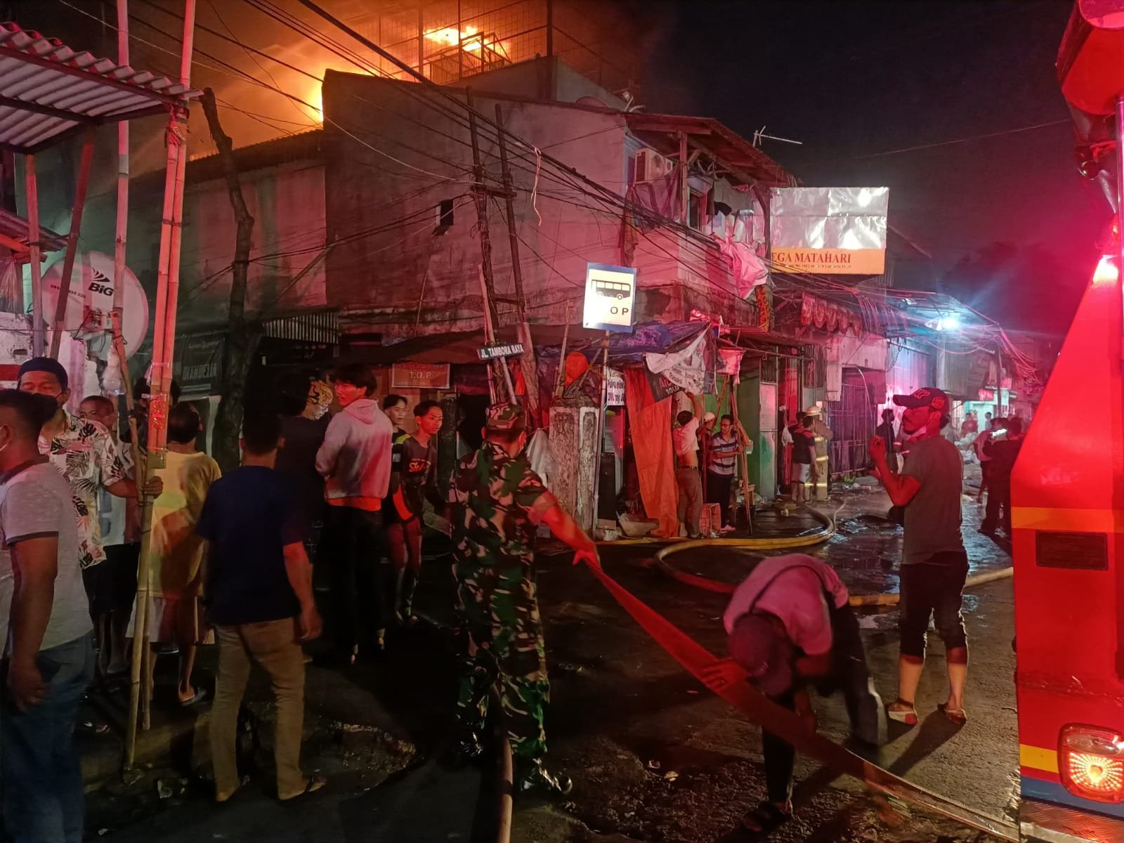 Kejadian tersebut juga di lihat oleh saksi ke dua Bapak Bobi umur : 48 Tahun alamat : Jl.Tambora Raya, No. 08, RT 01 RW 04, Kelurahan Tambora, Kecamatan Tambora Jakarta Barat yang juga berteriak untuk memberitahukan warga bahwa ada api yang menyala di atas Rumah Toko Mega Matahari, Mendengar teriakan tersebut warga berdatangan kemudian menghubungi pemadam kebakaran Kecamatan Tambora Jakarta Barat, Jelas Serka Sinaga.