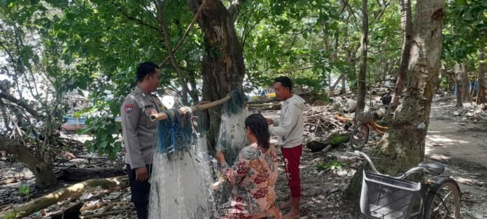 Disaat Pak Bhabin melaksanakan sambang, Pak Saiful beserta istri sedang merapihkan jaring pancing yang biasa digunakan sang suami untuk mencari ikan di lait.