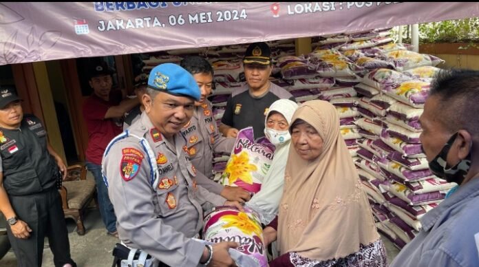 Para petugas dan donatur dengan ramah dan cermat membagikan beras kepada setiap penerima, menunjukkan rasa kepedulian yang tulus dari institusi Kepolisian terhadap masyarakat, khususnya para lansia.