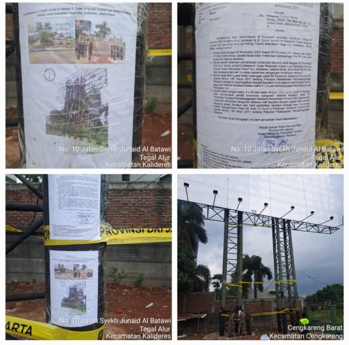 ACTUALNEWS.ID, JAKARTA – Tim gabungan yang terdiri dari TNI dan Satuan Polisi Pamong Praja (Satpol PP) DKI Jakarta kembali melakukan langkah simbolis dalam penegakan hukum reklame ilegal di Jakarta Barat. Pada Selasa (26/11/2024), mereka melakukan penyegelan dan pemasangan garis Pol PP Line di sekitar bangunan reklame yang terletak di Jalan Outer Ringroad Lingkar Luar, Tegal Alur, Kalideres. Penyegelan ini merupakan tindak lanjut dari Surat Peringatan (SP) pertama yang telah dikeluarkan oleh Satpol PP DKI Jakarta, yang mewajibkan pemilik reklame untuk segera membongkar struktur tersebut.