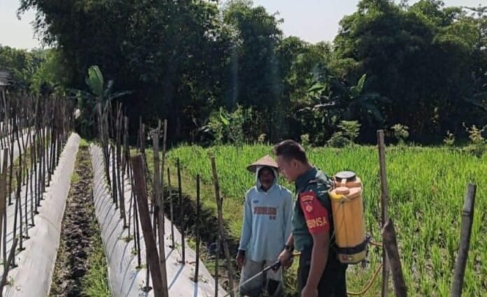 ACTUALNEWS.ID, Sragen – Serda Suratno Babinsa Desa Sepat Koramil 03/Masaran Kodim 0725/Sragen membantu petani dalam melakukan penyemprotan pestisida ke tanaman melon agar terhindar dari kerusakan yang disebabkan oleh hama, Rabu (13/12/2023)