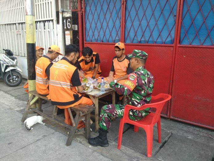 ACTUALNEWS.ID, Kodam Jaya, Jakarta Barat – Serka Kusnodin anggota Koramil 01/Tamansari Kodim 0503/Jakarta Barat sambangi petugas PPSU dalam rangka melaksanakan Komunikasi Sosial (Komsos) di Jalan Keagungan Kelurahan Keagungan, Kecamatan.