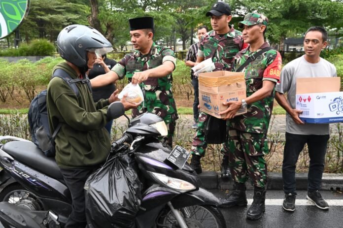 ACTUALNEWS.ID. SUKOHARJO,-Sinergitas Kodim 0726/Sukoharjo dan Polres Sukoharjo berkolaborasi dengan Fave Hotel Solo Baru, Komunitas PSC, Newsroom Peduli, CJDW Netrowk, dan ICS Sukoharjo menggelar pembagian takjil di simpang empat The Park Solo Baru, Rabu (18/4/2023).
