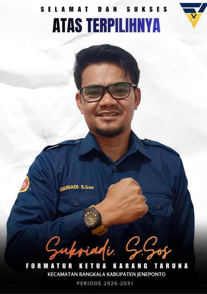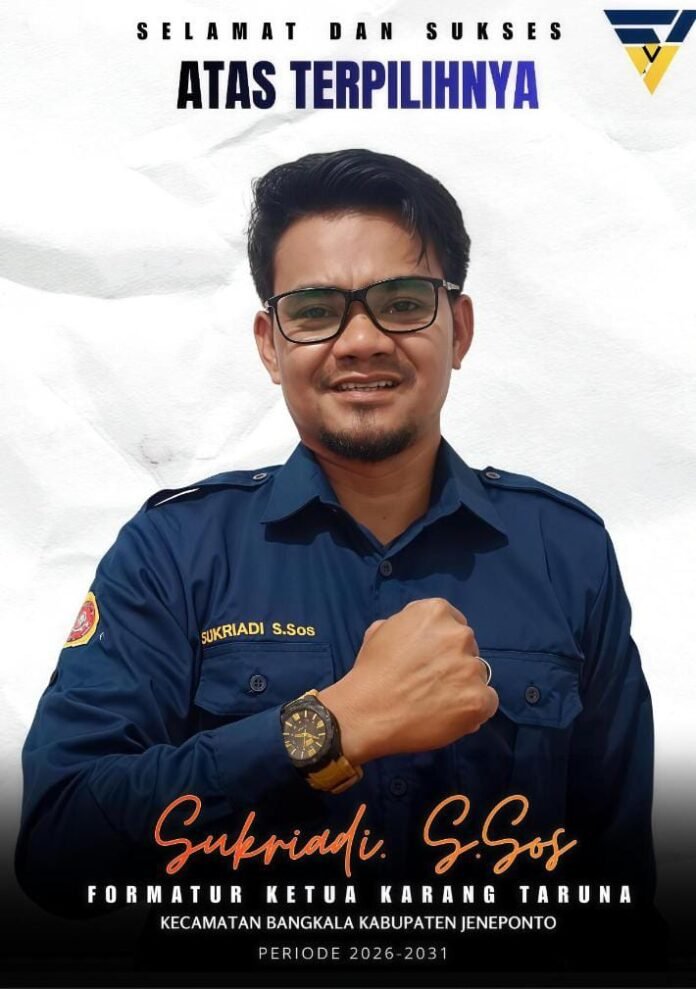 JENEPONTO – SUKRIADI S,SOS.resmi terpilih sebagai Ketua Karang Taruna Kecamatan Bangkala Kabupaten Jeneponto, melalui mekanisme aklamasi dalam pemilihan yang digelar pada Sabtu 4 April 2026.