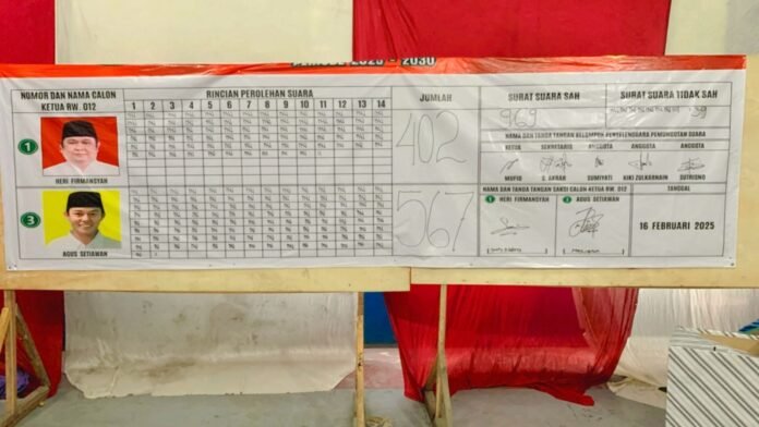 Pemilihan saat itu pada Minggu 16 Februari 2025 ada dua calon. Calon nomor 1 Heri Firmansyah dengan peroleham suara 402, sedangkan Agus Setiawan nomor urut 3 mendapat suara 567, namun sayangnya kemenangan Agus Setiawan diprotes ada kejanggalan izajah Paket C miliknya sebagai persyaratan iniuntuk pencalonan.