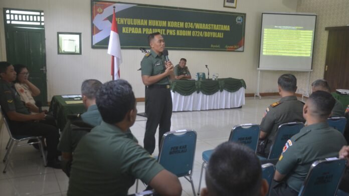 ACTUALNEWS. ID Boyolali – Dalam rangka meningkatkan kesadaran hukum bagi Prajurit jajarannya, Kodim 0724/Boyolali menerima Penyuluhan Hukum bagi Prajurit dan PNS dari Korem 074/Warastratama yang dilaksanakan di Aula Makodim 0724/Boyolali Jl. Padanaran Desa Tegalmulyo Kecamatan Mojosongo Kabupaten Boyolali. Kamis ( 03/08/23)