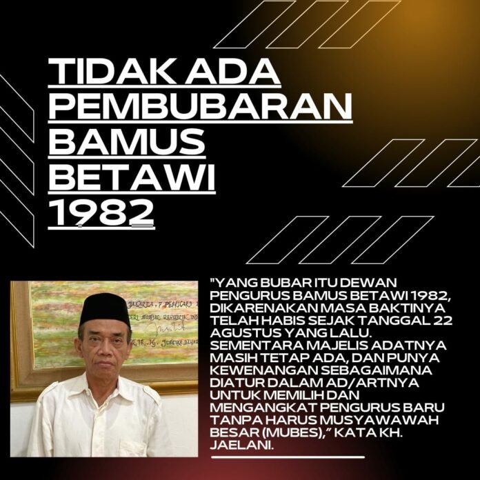 ACTUALNEWS. ID Jakarta, – Beredarnya isu pembubaran Bamus Betawi 1982 setelah terbentuknya Majelis Kaum Betawi yang dinakhodai oleh Marullah Matali belum lama ini ditepis oleh seorang tokoh Betawi kharismatik, yang juga merupakan anggota Majelis Adat Bamus Betawi 1982, KH. Ahmad Jaelani, Lc.