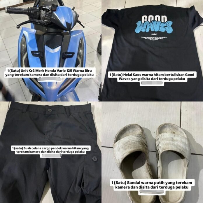 “Pelaku sudah kami amankan bersama barang bukti berupa sepeda motor Honda Vario, kaos hitam bertuliskan Good Waves, celana cargo hitam, dan handphone iPhone 11 Pro Max. Saat ini sedang kami lakukan pemeriksaan dan pengembangan, dan kami masih melakukan pengejaran terhadap pelaku lainnya yang terlibat,” kata Kompol Pengky.
