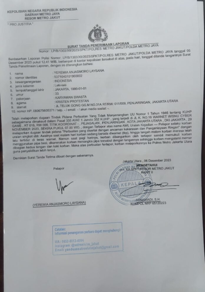 ACTUALNEWS.ID Jakarta -Seorang Warga Penjaringan Yeremia Anjasmoro Laysana didanpingi Kuasa Hukumnya dari D’SATRIAD LAW FIRM dan LBH AMANAH INDONESIA RAYA Trio Segara, S.H.M.H telah melaporkan ke Polres Metro Jakarta Utara atas Kasus dugaan tindak pidana perbuatan yang tidak menyenangkan, yang dilakukan oleh terlapor inisial A. Peristiwa terjadi di Jalan K. No. 16 Warnet Wisnu Cyber Game RT. 009 RW. 009 Pejagalan Penjaringan Jakarta Utara. Kejadian sekira pukul 07.00 WIB. Jumat (08/12).