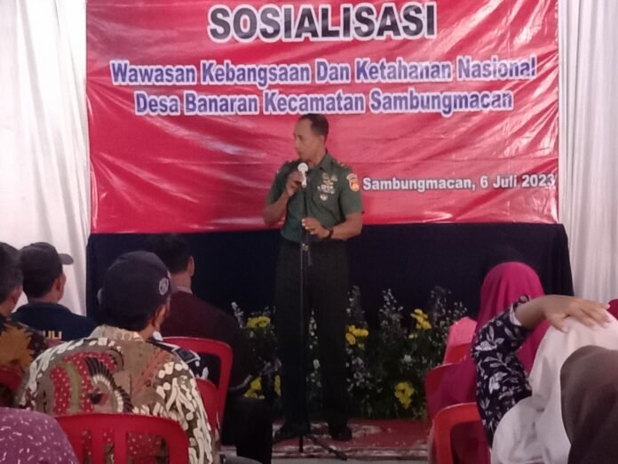 ACTUALNEWS.ID, Sragen, Guna menanamkan semangat bela negara dan rasa cinta tanah air, Pelda Hery Suprapto Bati Tuud Koramil 09 /Sambungmacan Kodim 0725/Sragen melaksanakan sosialisasi Wawasan Kebangsaan dan Ketahanan Nasional, sebagai penanggung jawab kegiatan Suyanto, SE (anggota DPRD Kab. Sragen Fraksi PDI P),Jum’at ( 07/07/2023 )